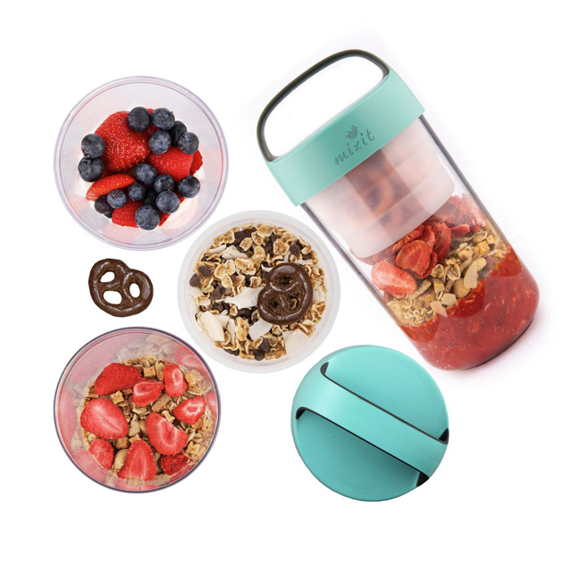 Zachrastenie tubusu miesto budíka nezabralo a školák sa aj tak vyhrabal z postele päť minút pred odchodom? Potom je tu Mixit2go – dóza, do ktorej mu pripravíte raňajky presne ako doma, a zje si ich hneď po prebudení počas druhej prestávky. Jogurt sa dá jednoducho oddeliť od müsli, takže si ich môžu zmiešať až vtedy, keď budú mať chuť, a chrumkavosť zostane zachovaná. Na výber sú dve veľkosti a dve farby a vo všetkých bezpečne prenesiete aj šaláty s dressingom, kaše či čerstvé ovocie a zeleninu s dipom. Hodí sa tak nielen do aktoviek, ale pokojne aj do kabeliek a tašiek pracujúcich rodičov, ktorí síce vstali na budík, ale chrastenie tubusom nad hlavou ich školákov ich trochu zdržalo a raňajky či obed nestíhajú.