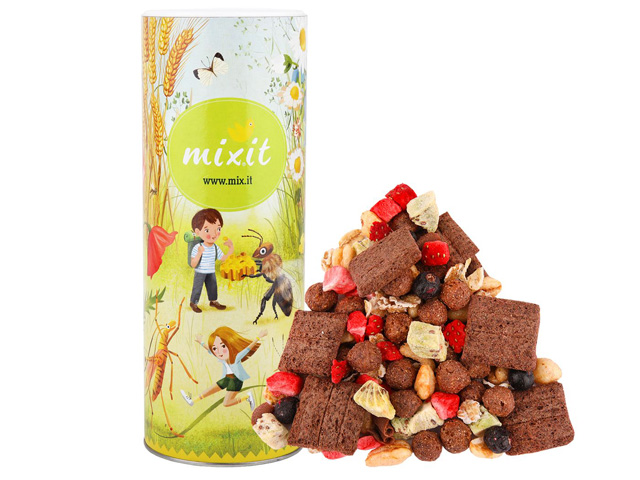 Mix do lavíc, 7,99 €/370 g, zloženie: pšeničné lupienky, ovsené lupienky, kakaové vankúšiky, kakaové extrudované guľôčky, pšeničné pukance medové, čokoládové hobliny mliečne, lyofilizované jahody, lyofilizované kiwi, lyofilizované čierne ríbezle
